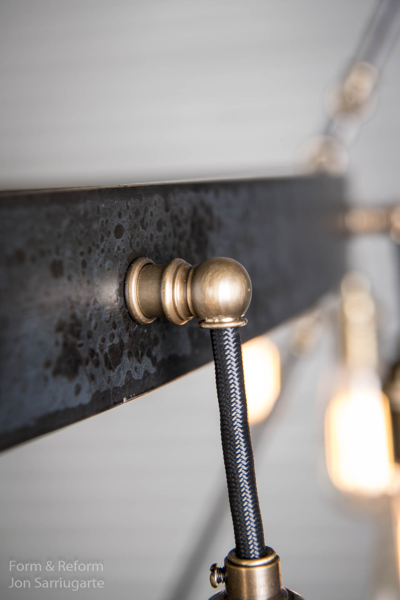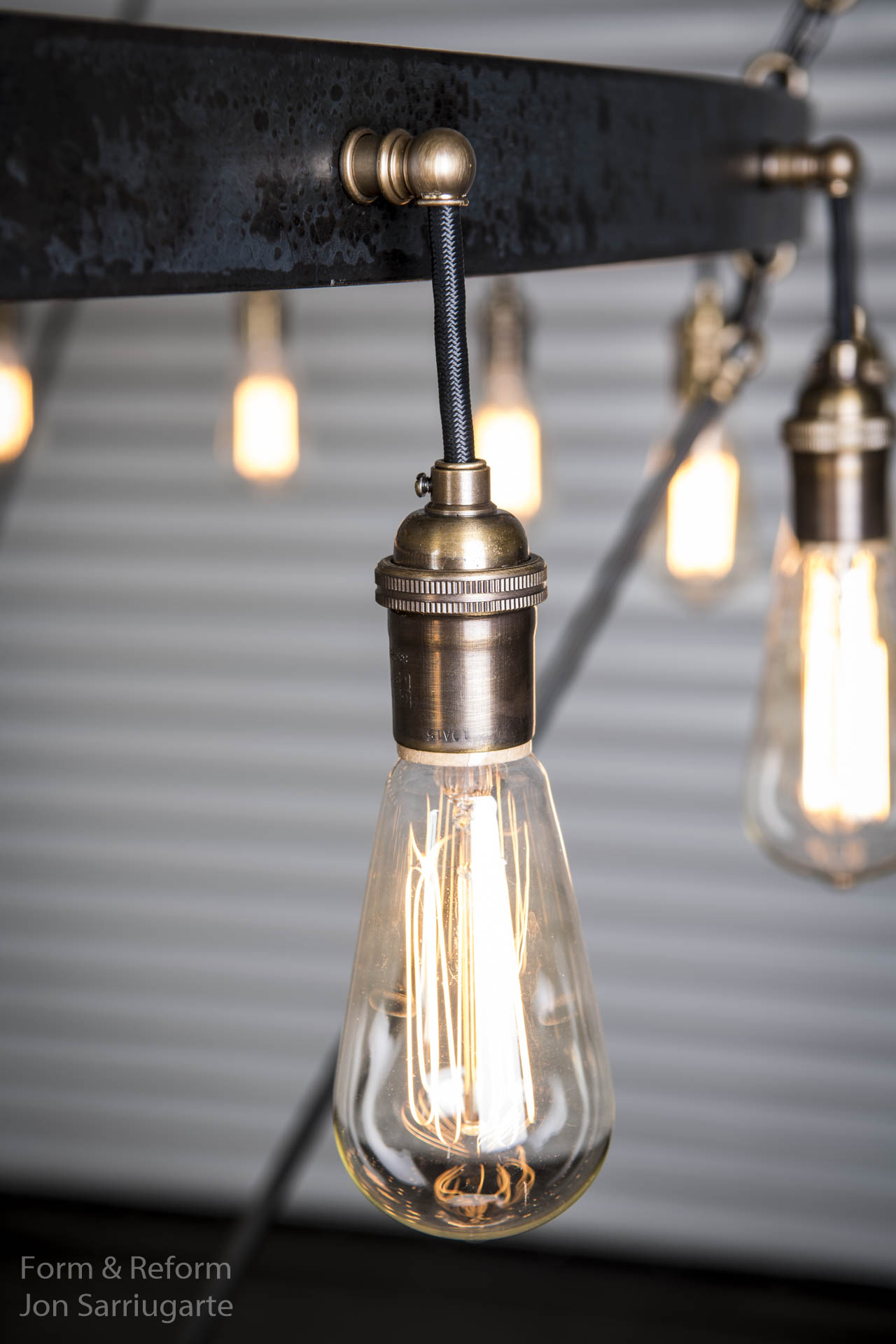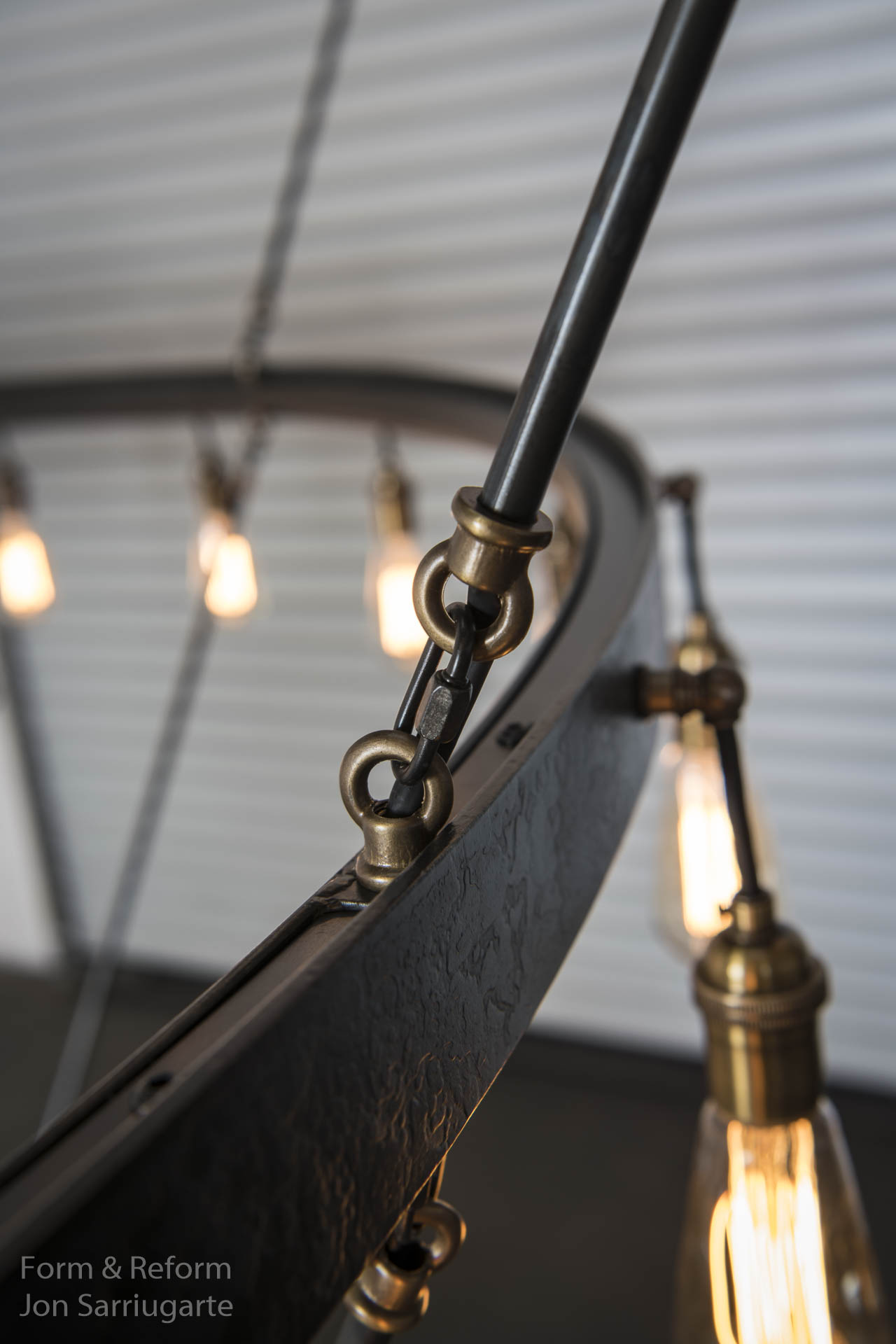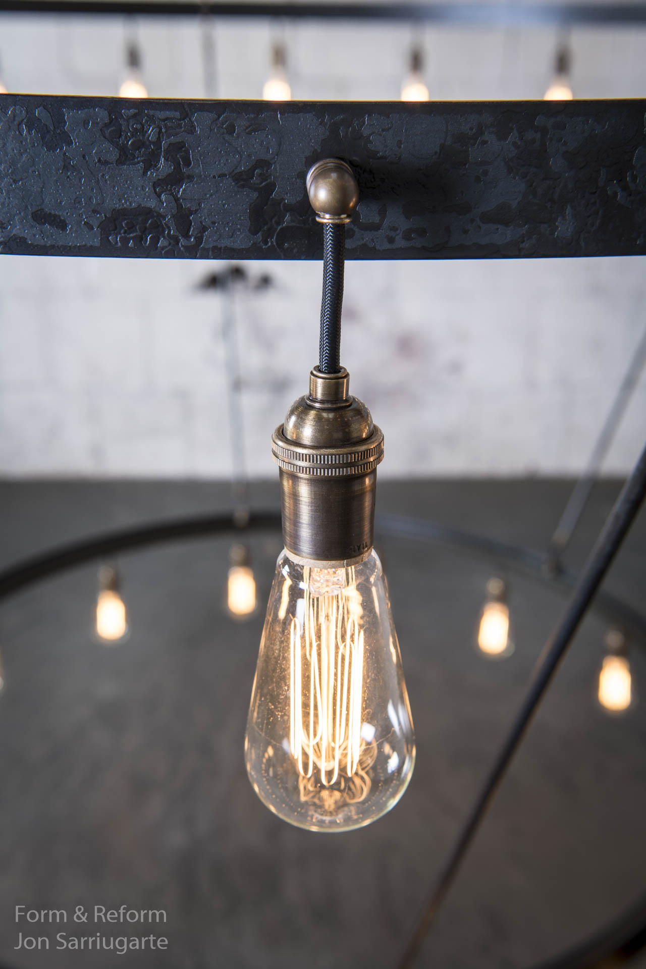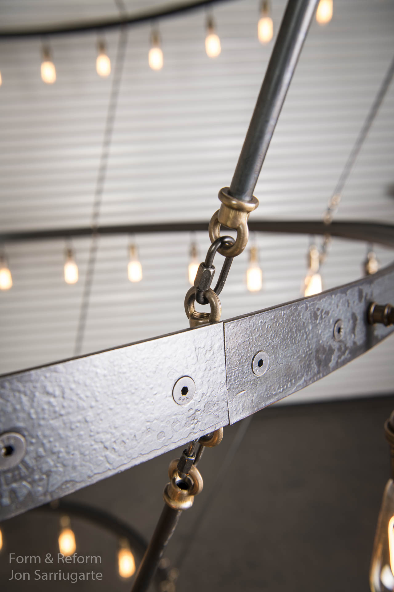 The Atwood light is a grandiose chandelier that is the largest light we have ever done. It is 3 inches wider than the Morningside chandelier that inspired this light due to the bulbs hanging from the exterior of the rings. Both have 75 sockets that is almost eleven feet in diameter and comes apart into thirds to be shipped and reassembled on site.