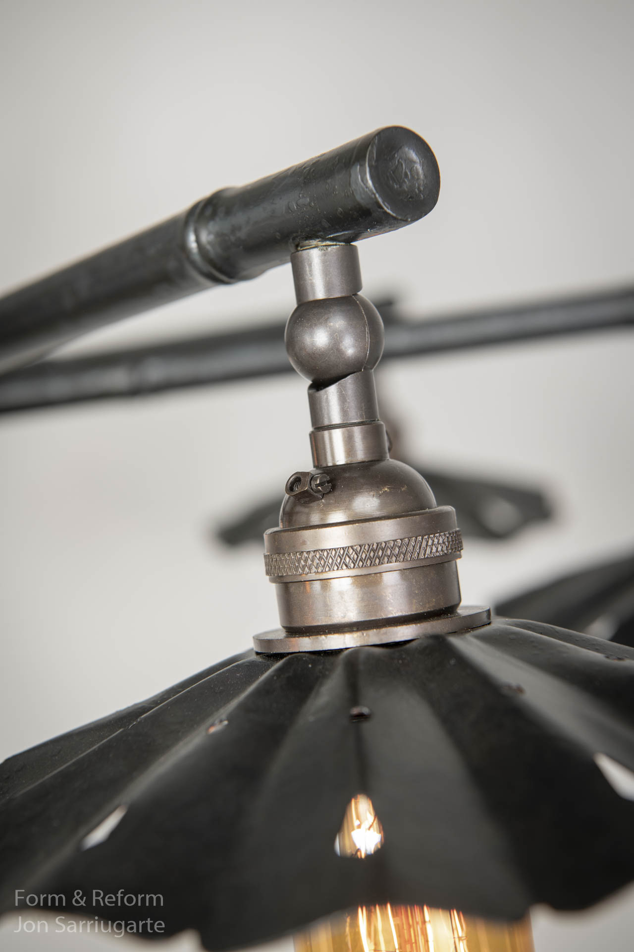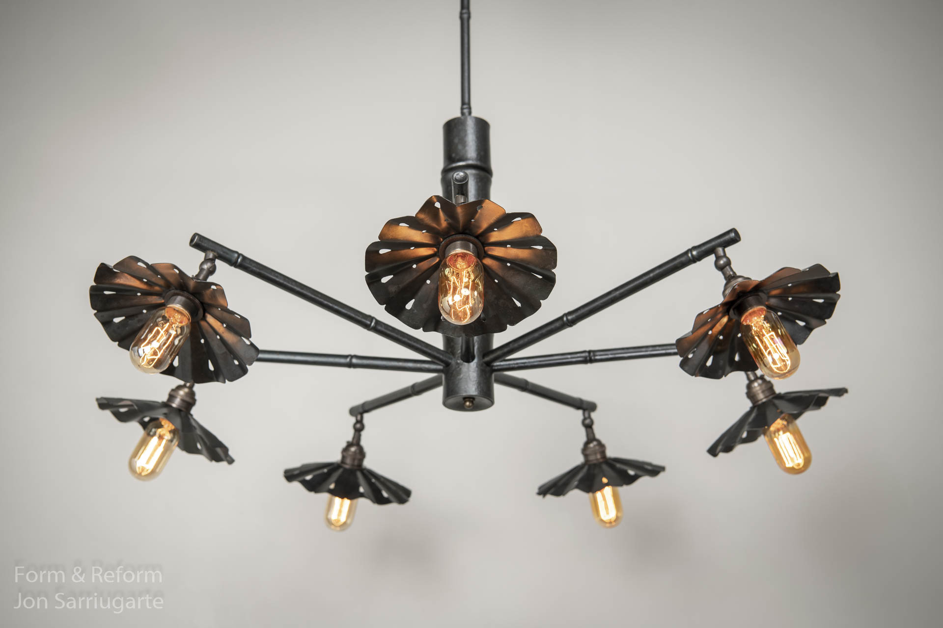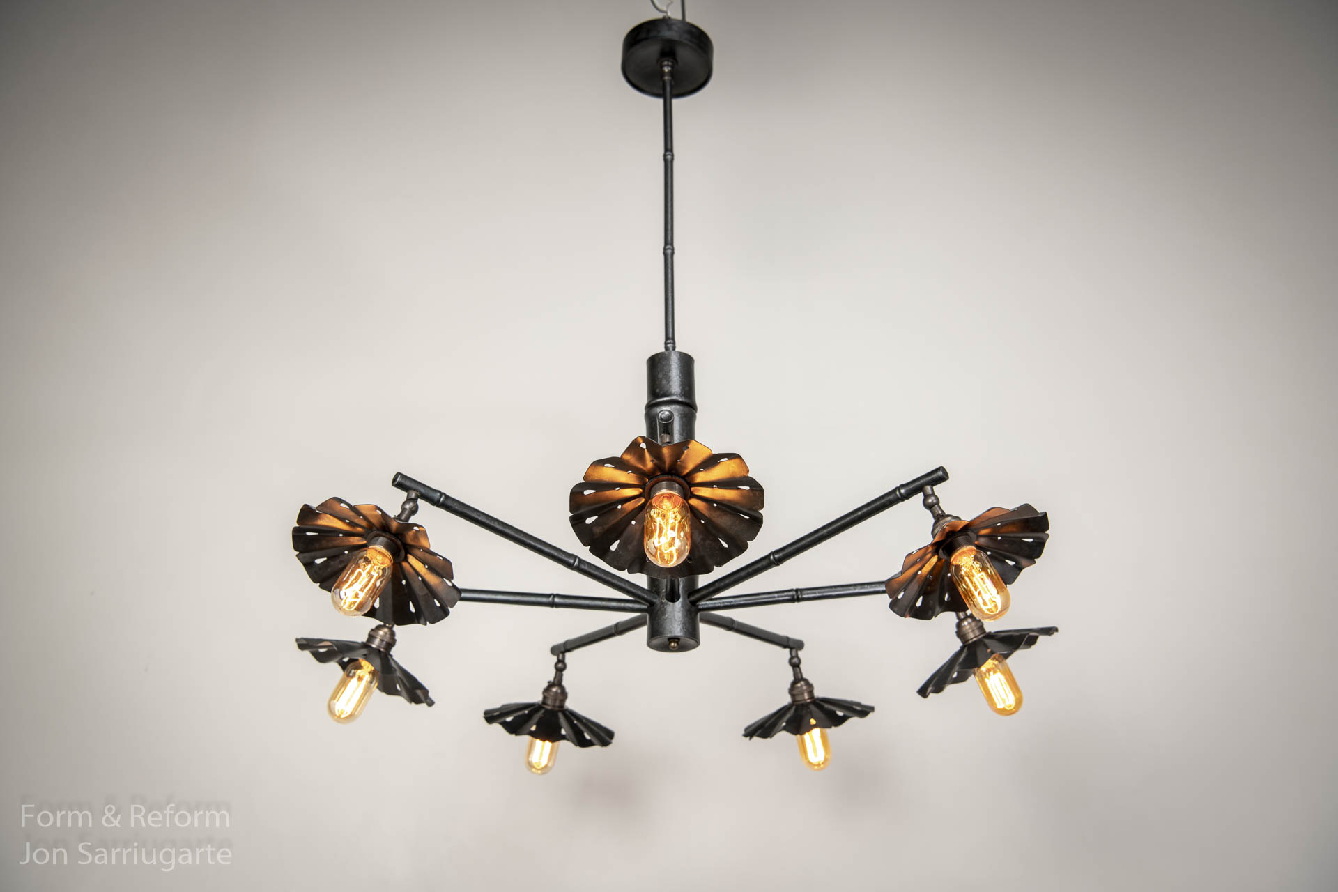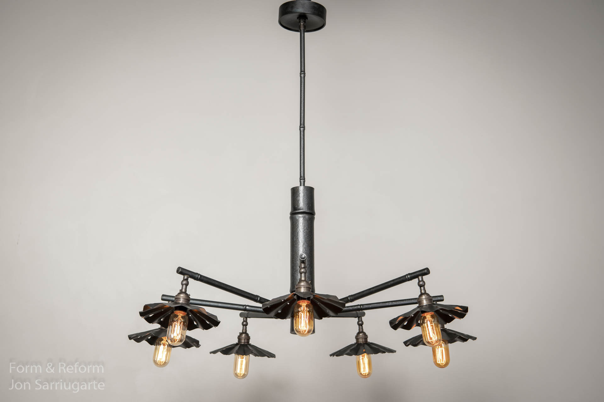 This chandelier inspired by Adventure Land at Disney was designed for Jon's house, and uses steel formwork to convey the aesthetics of bamboo.