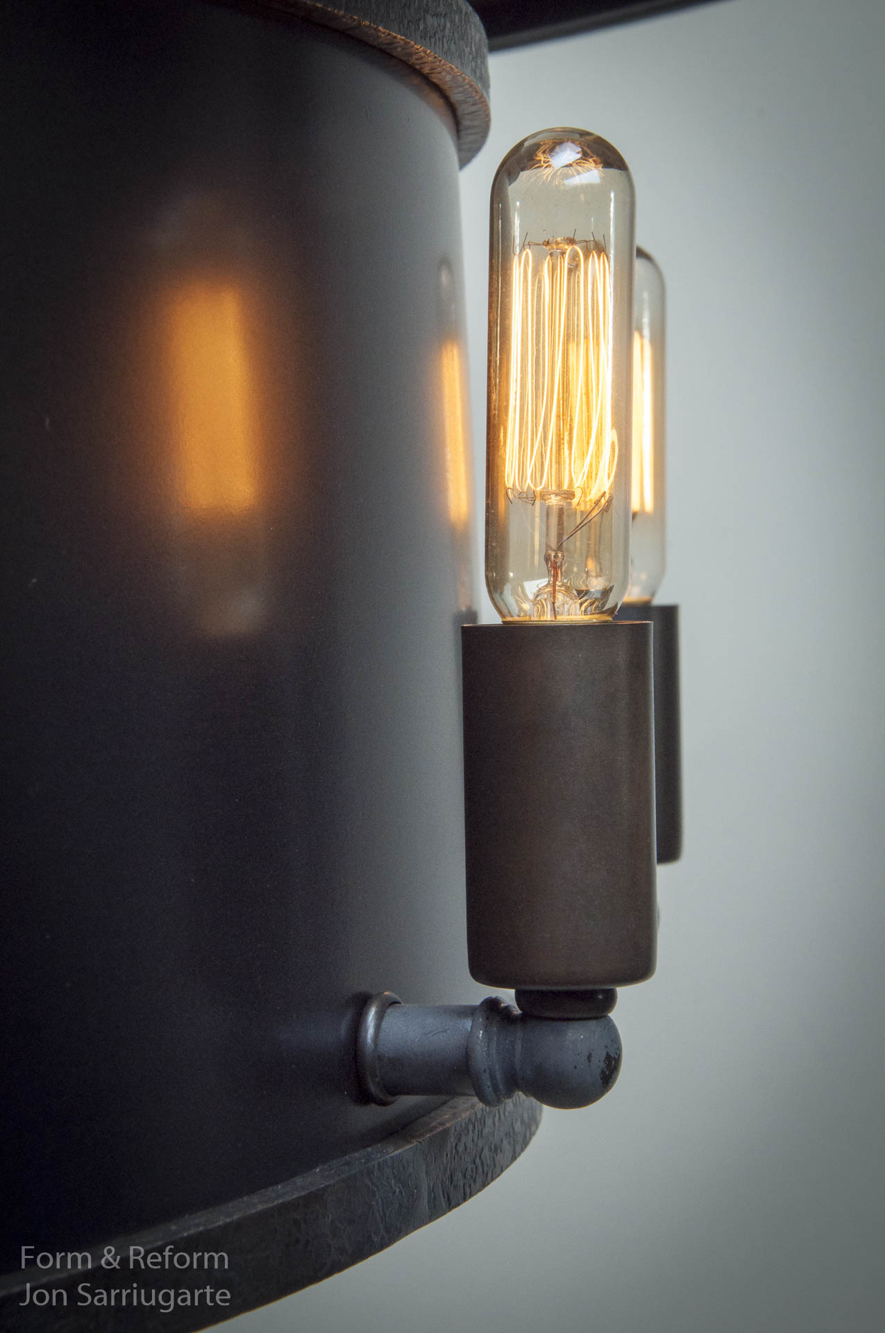 A solid chandelier that adds a bold statement. The illuminated reflection of the light bulbs off of the raw black steel creates a stunningly delicate offset pattern of warm light.