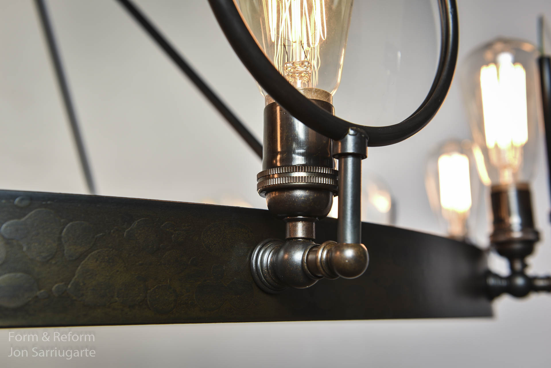 The Gaslight Lens chandelier by Jon Sarriugarte is a custom lighting design that is inspired by the classic gas lamps of the 19th century. It features a large glass lens, which serves as the shade for the light source, and is suspended from a forged metal frame. The lens is hand-crafted using high-quality cast glass, giving it a unique and high-quality appearance. The metal frame is also hand-forged with a firescale textured steel, giving it a distinctive, industrial look. The Gaslight Lens fixture provides bright, focused light and is often used to complement a range of decor styles, from modern to traditional. It is a versatile piece that can be used in homes, offices, and commercial spaces to add a touch of elegance and sophistication while providing functional lighting.