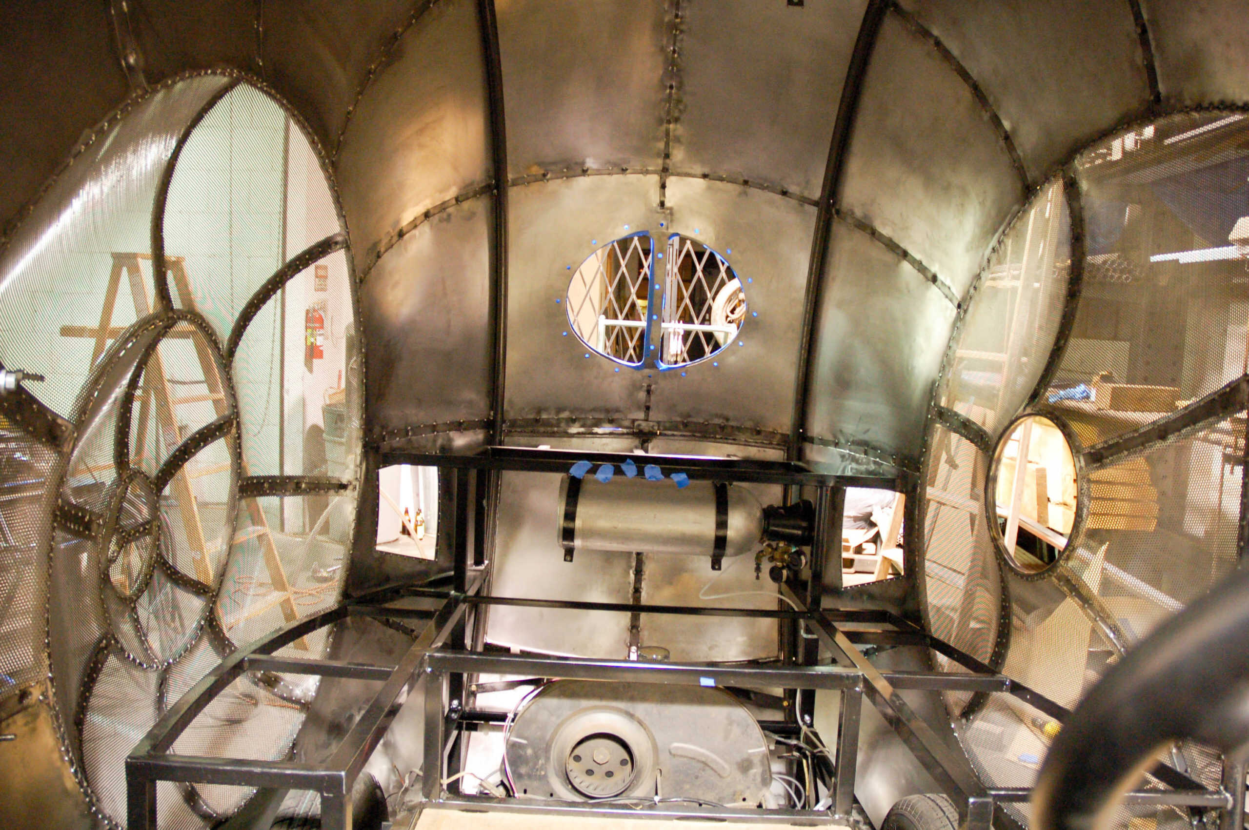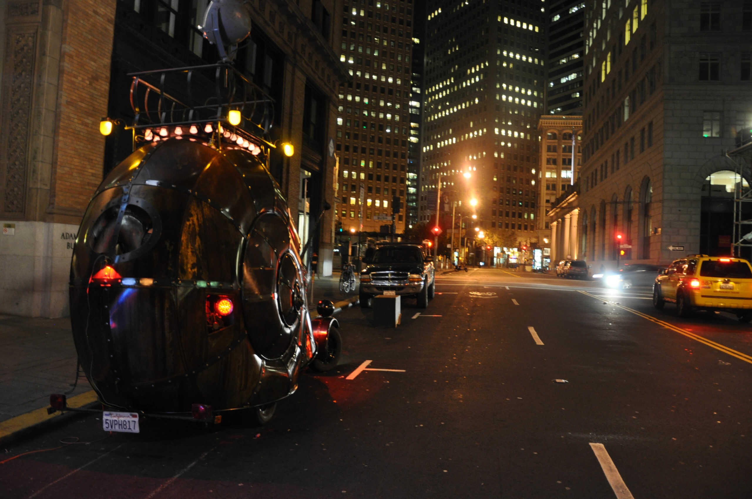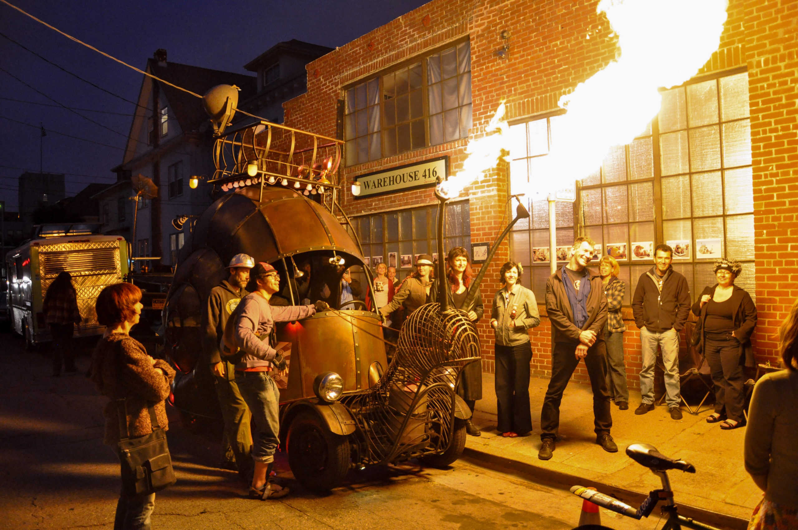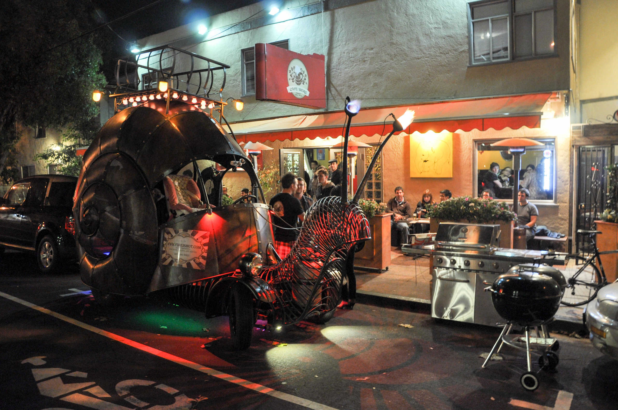 The Golden Mean Snail Car is a giant hot rod art car built by a group of artists in West Oakland’s Kraftworks building. Conceived of in a dream in 2008 by artist Kyrsten Mate, blacksmith Jon Sarriugarte, who fabricates custom home furnishings, worked with his wife, Kyrsten Mate to build this extraordinary vehicle with the help of the artist members of Empire of Dirt.
