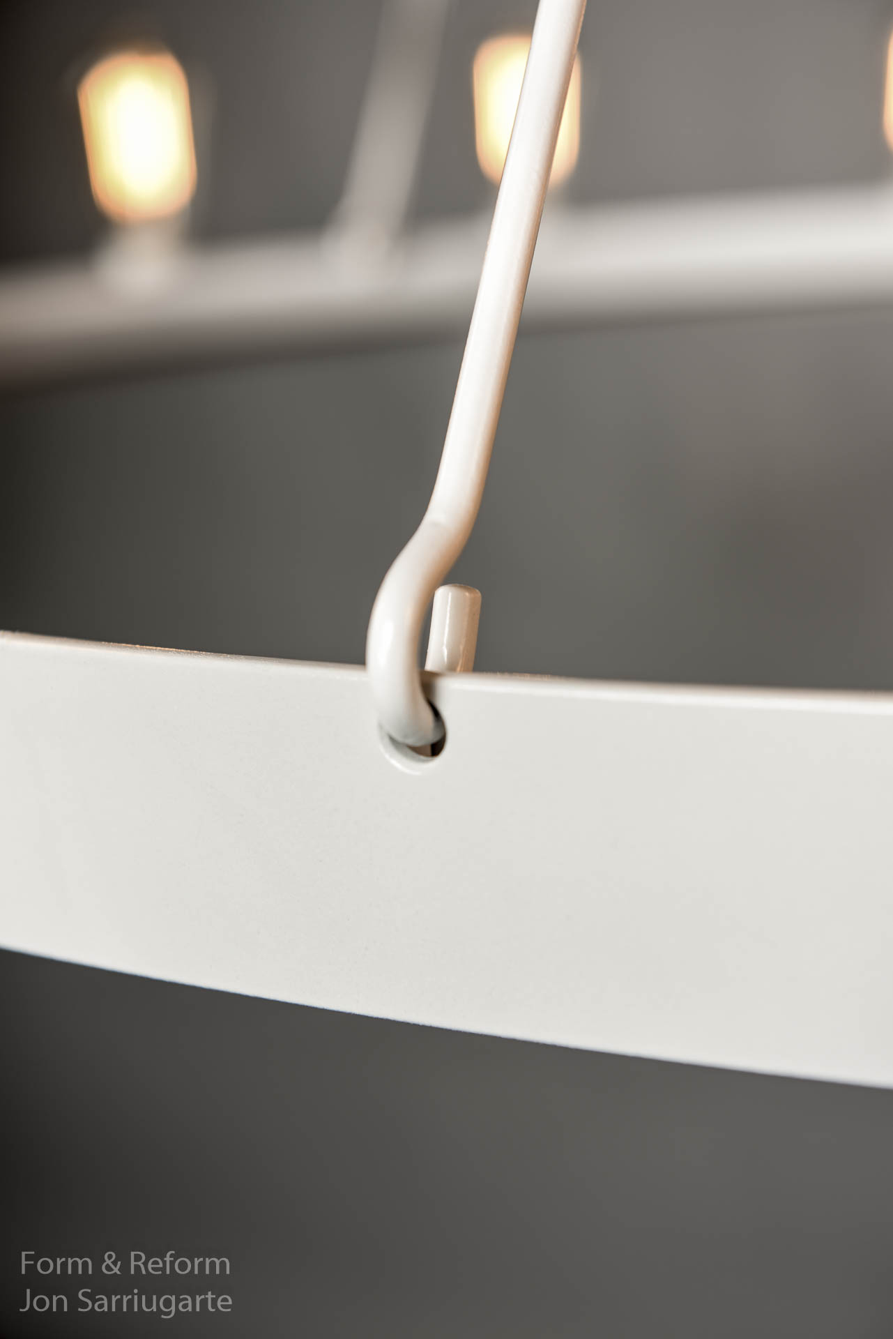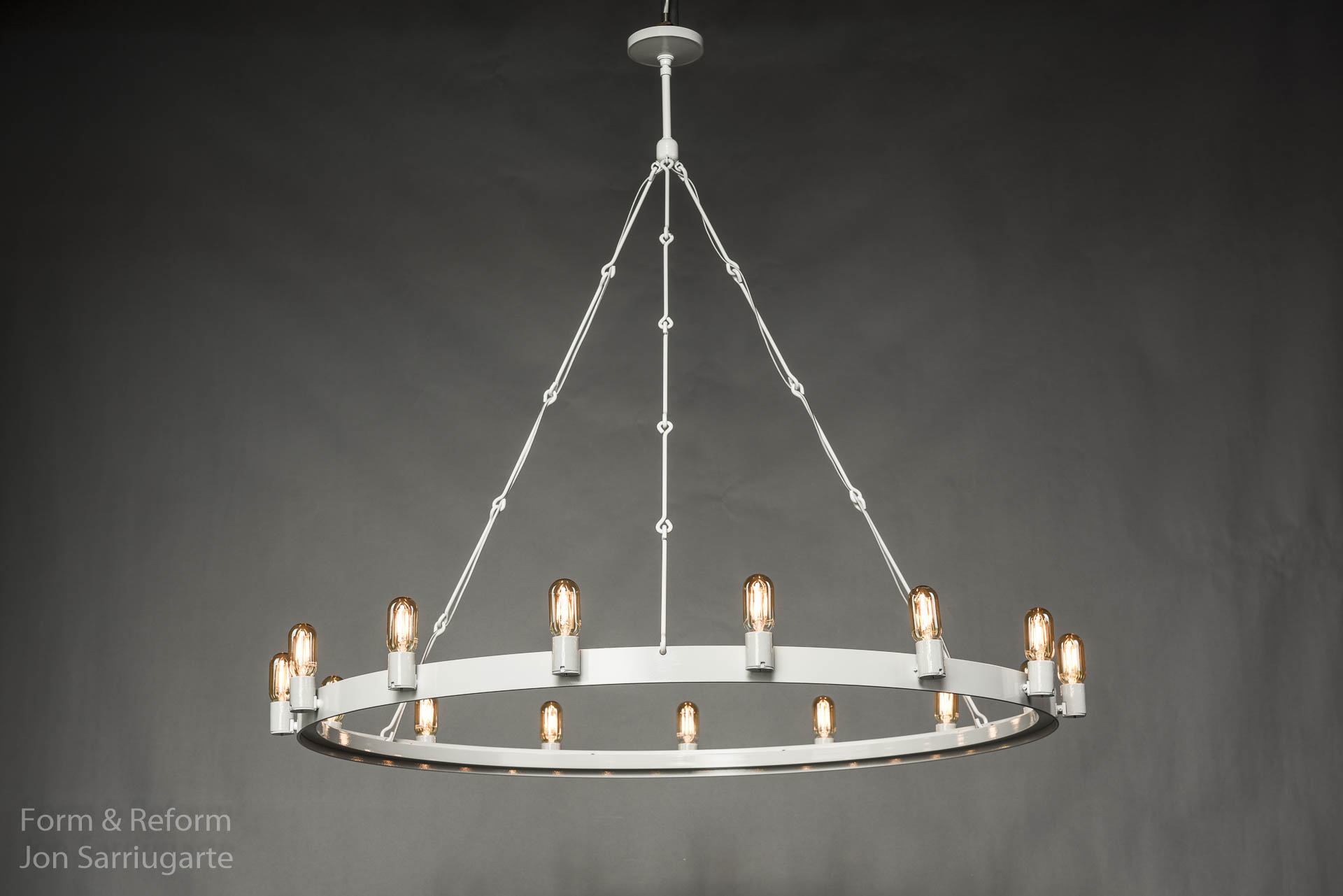 These lights were made for a former and much loved client who outfitted their restaurant, Camino, with an early rendition of our signature ring lights. While opening Kebabery, an eatery in North Oakland they decided to brighten the space with a couple of single tier versions of their Camino chandeliers but in white.