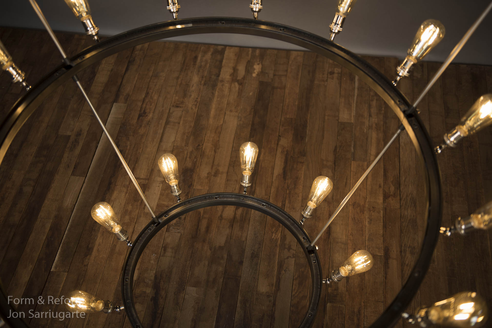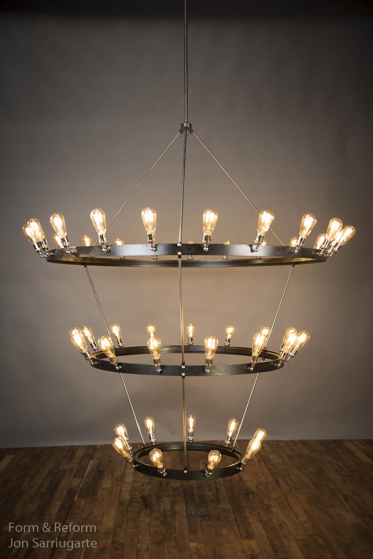 The Pizza Rock three-ring chandelier makes a statement in an eclectic and industrial space in Las Vegas — the bold conical shape fills the dining room with charming warm light; the industrial lines of forged steel with a firescale finish complement the brick walls; and the rings are heavily dotted with candelabra sockets, each able to swivel, to allow for a flexible appearance to keep things fresh.