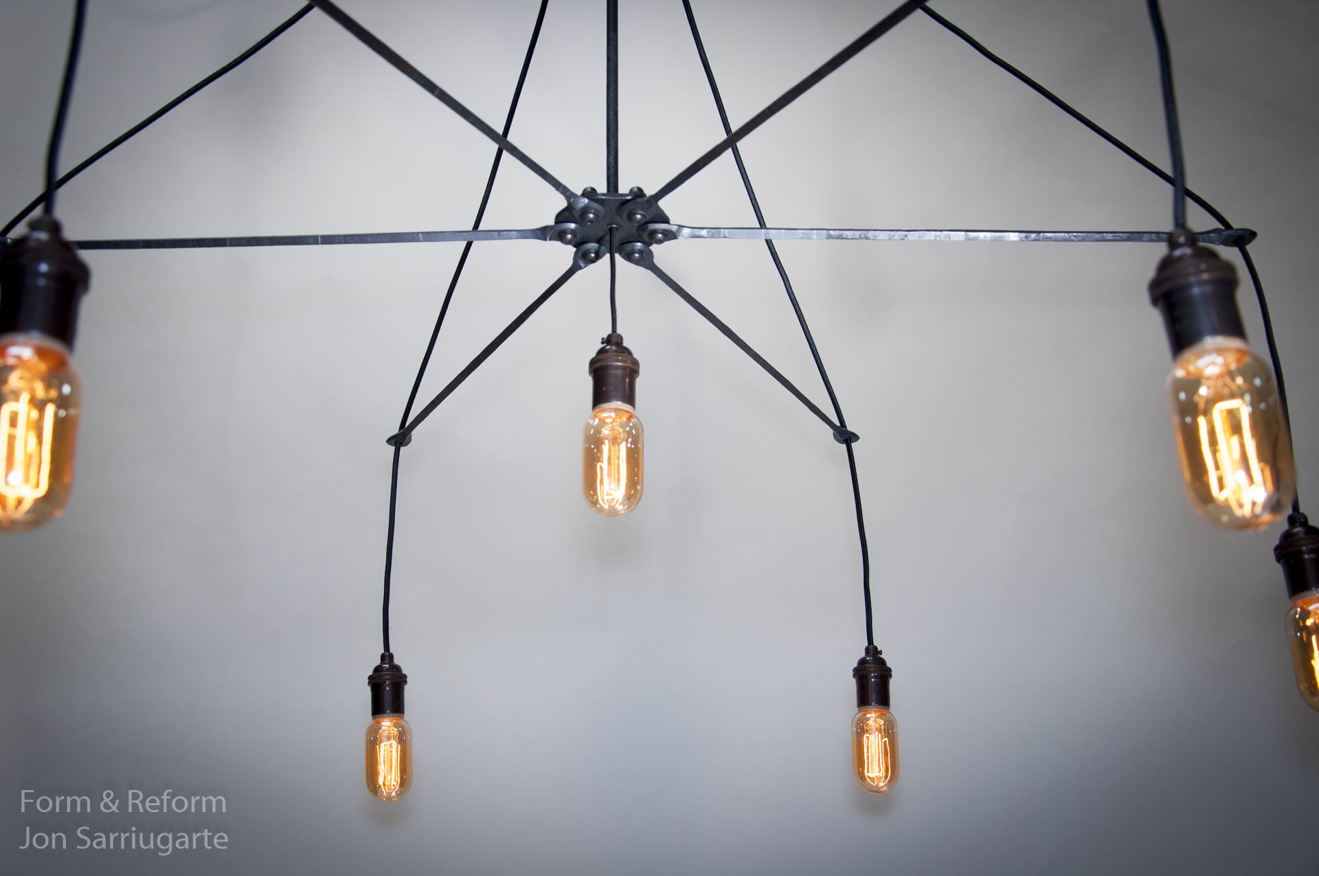 The Radial Line series was inspired by the spiny creatures drawn by biologist and artist Ernst Haeckel. These elegant lights are highly adjustable. Bulbs hang from fabric cords that pass through metal arms and through a central hub. When the hub is raised the fixture takes on a cone shape and the bulbs are lowered. Arms can be spread evenly or gathered together.