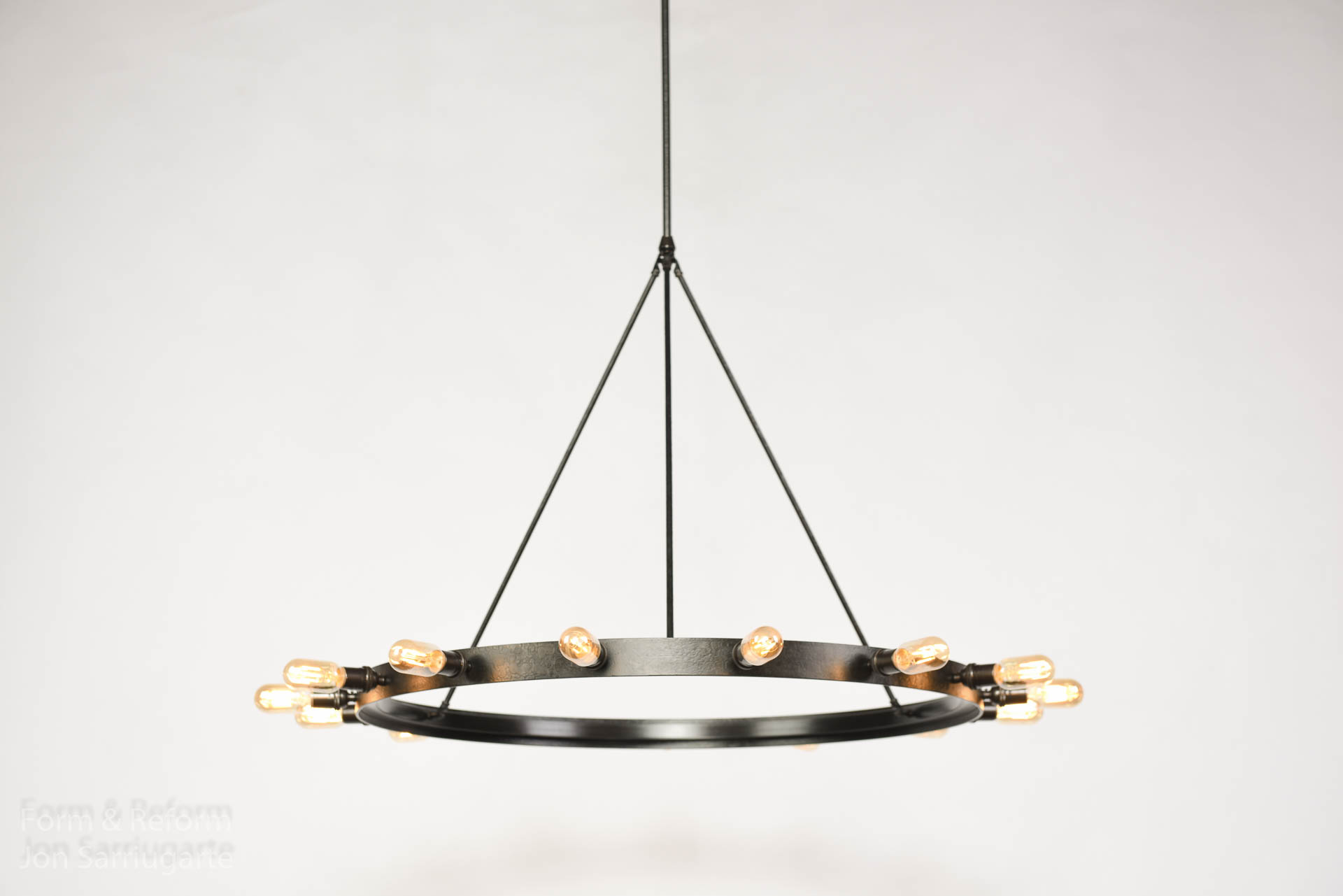 An adaptation to the Gioia chandelier to resonate with the Winthrop chandelier situated at the Harvard Winthrop House, this chandelier has clean geometric lines textured with a hand-forged firescale finish for a refined and balanced look.