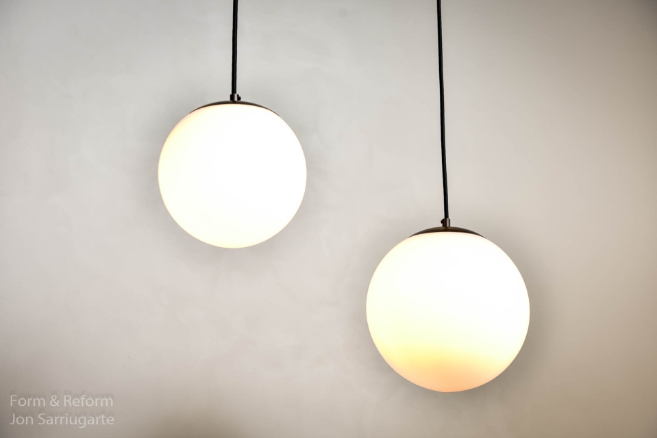 This mid-century modern pendant is a simple with frosted globes. See the rest of the Suspension Globe Collection.