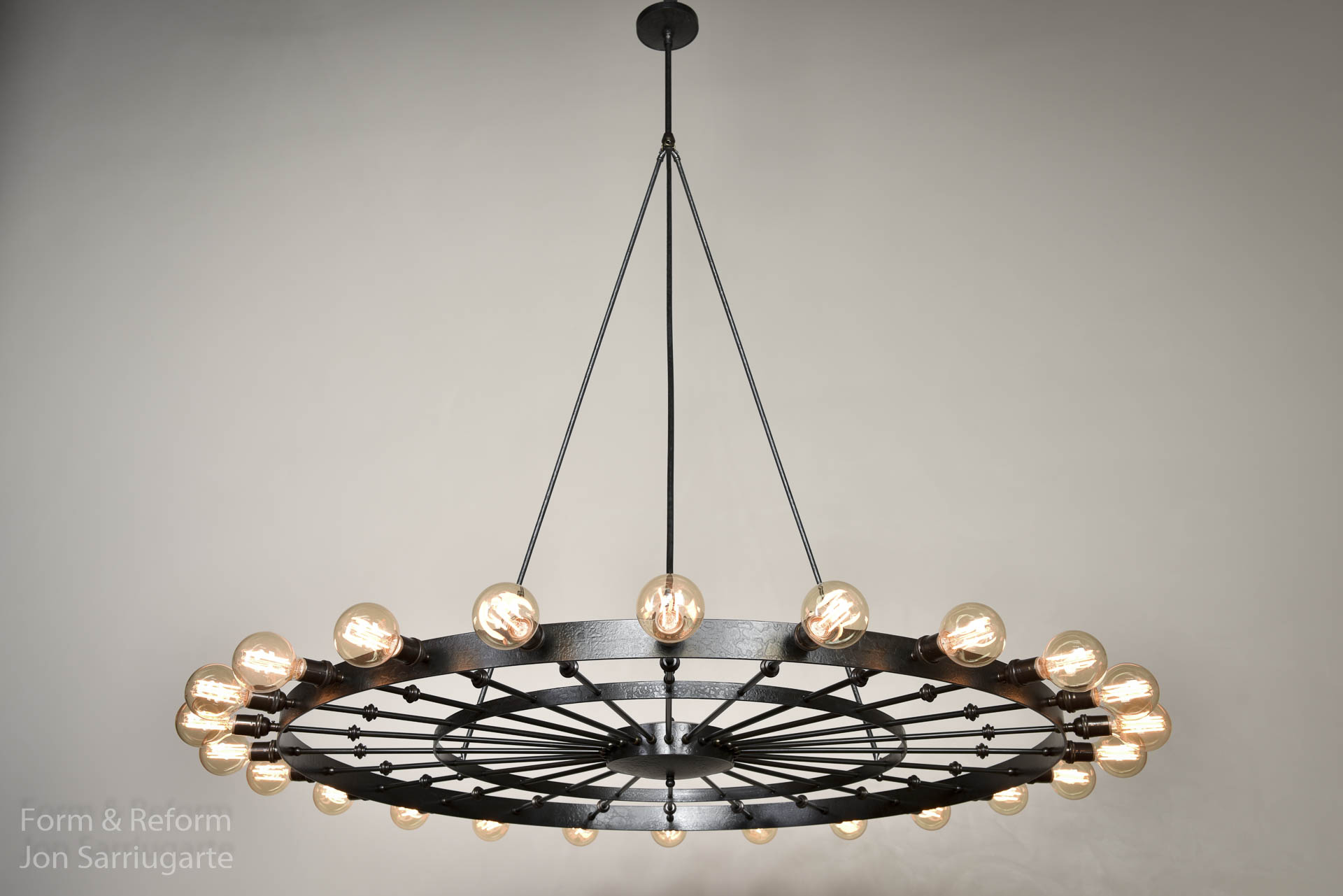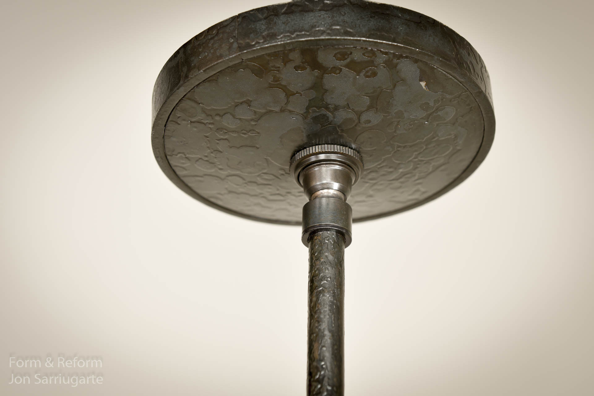 A modernized twist to existing historic chandeliers at the Harvard Winthrop House, this chandelier boasts hand-forged firescale rings juxtaposed with bronze fittings to achieve a refined yet striking presence.